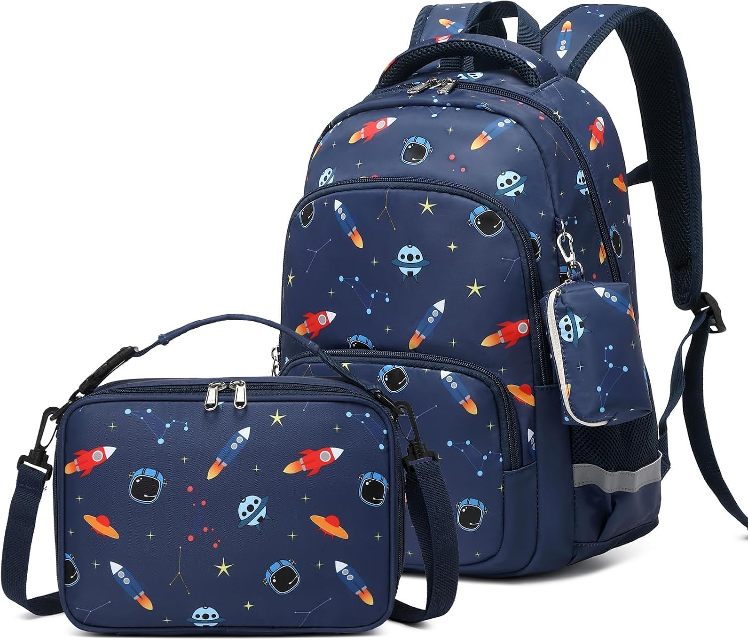 - The kids backpack set has a Dark Blue Rockets theme, measures 15.7”x11”x5.2 ”, lunch bag: 10”x7.5”x4.2”, and small coin pocket, cute matching sets for kids to go back to school.