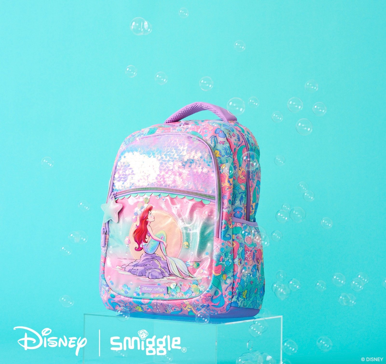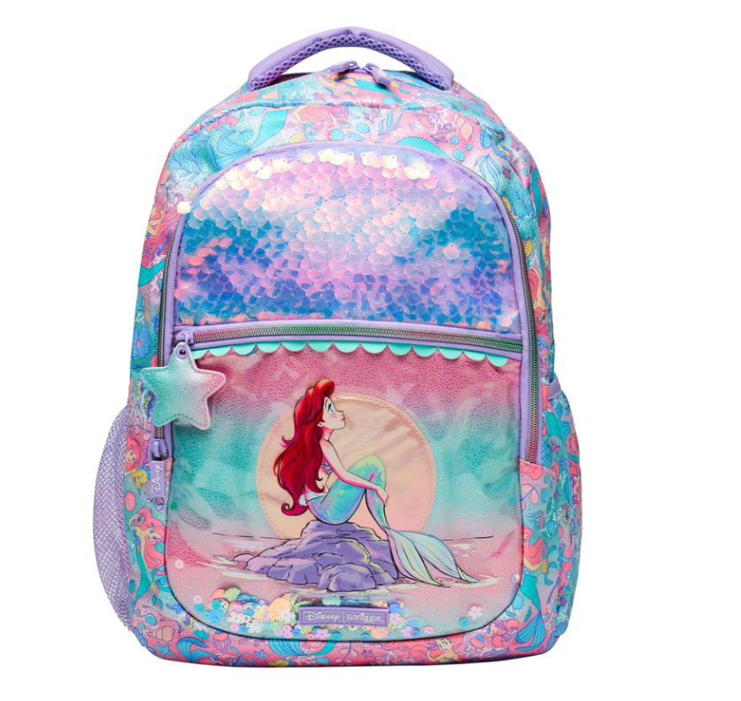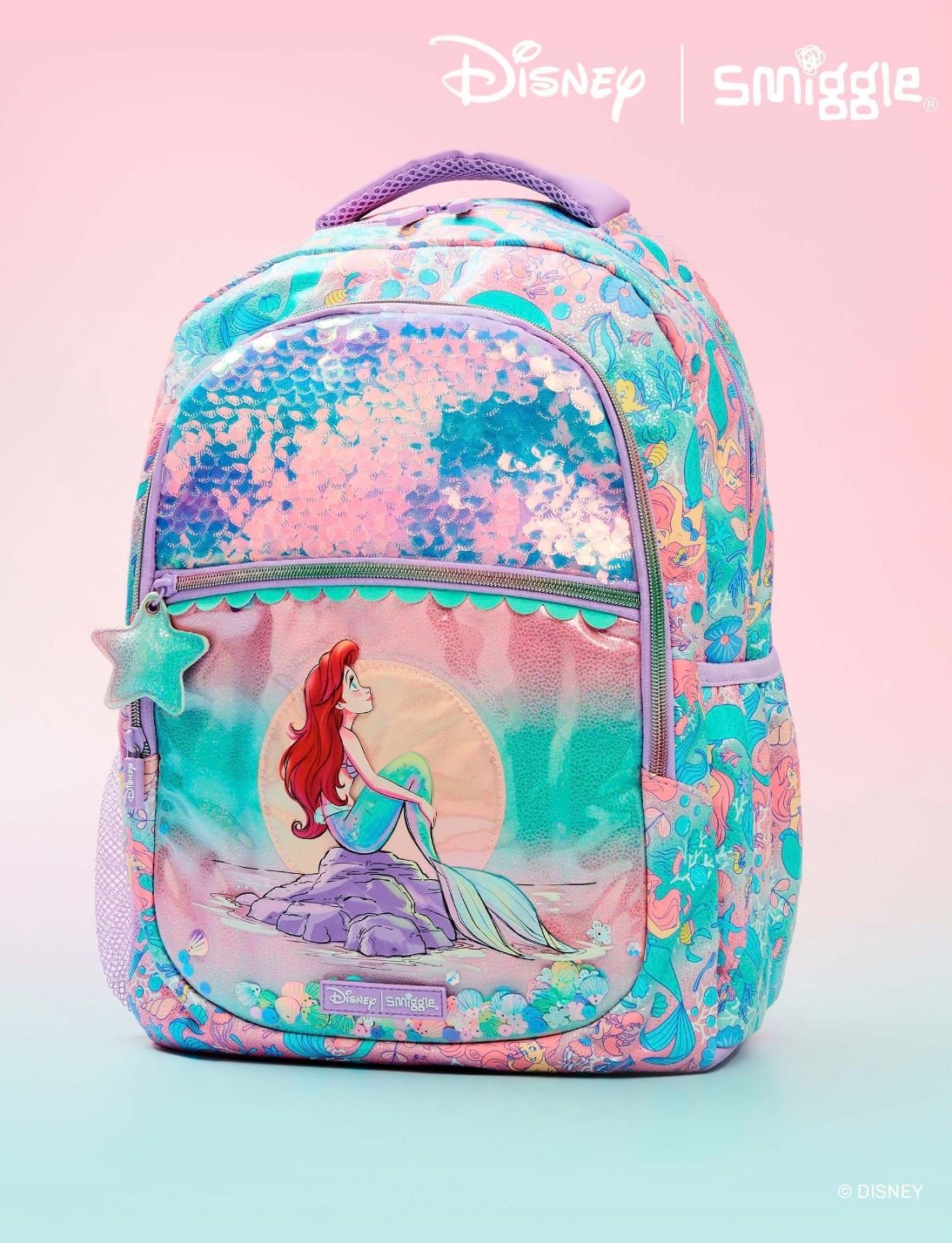 Our Genuine Smiggle Backpack has been sprinkled all over with Disney magic! Our Ariel Classic Backpack has plenty of extra whimsical details such as glimmering shell shaped sequined fabrication, padded starfish zips and iridescent paneling!