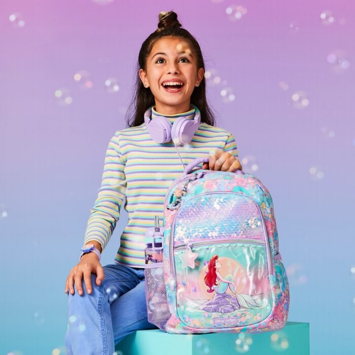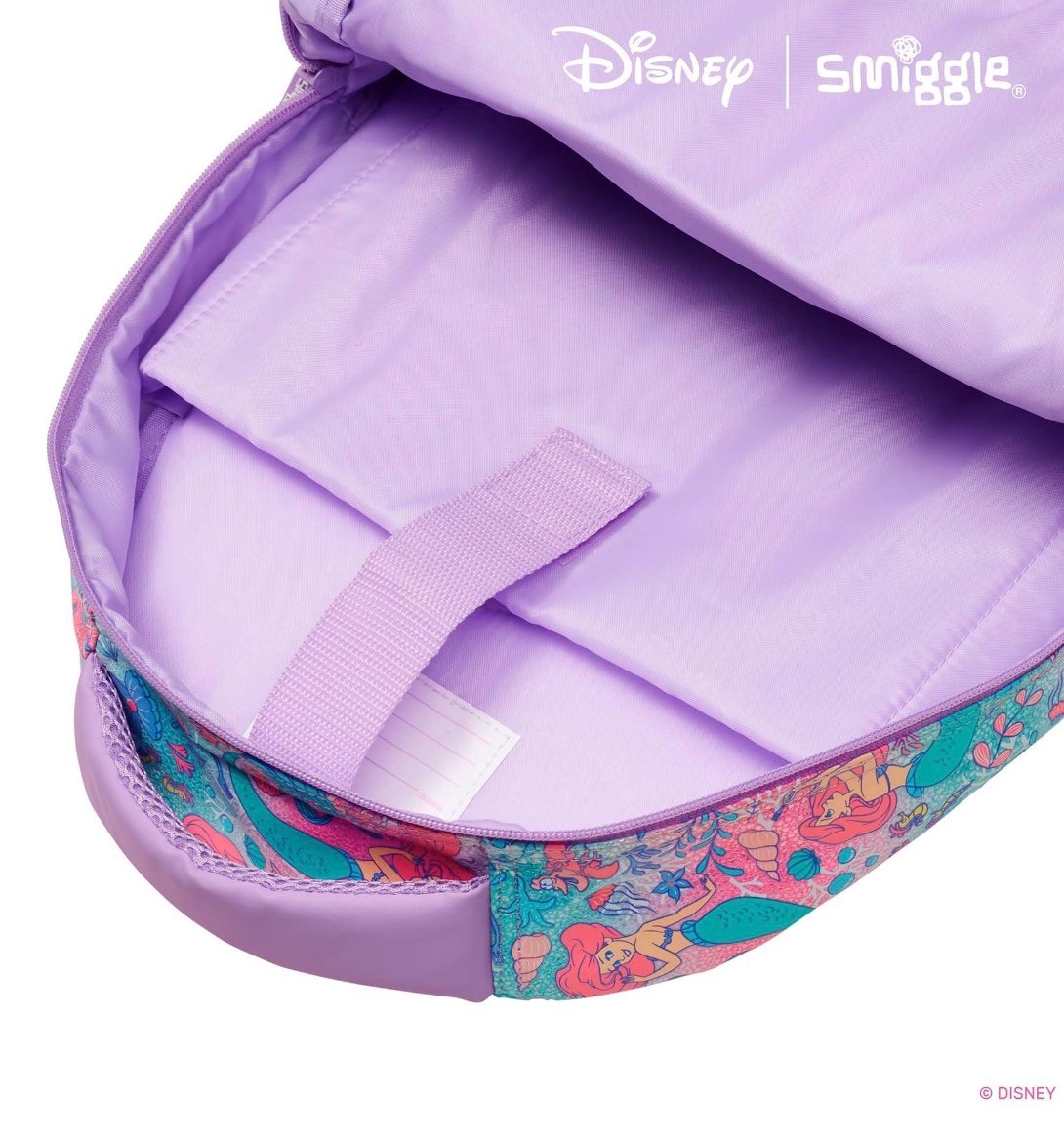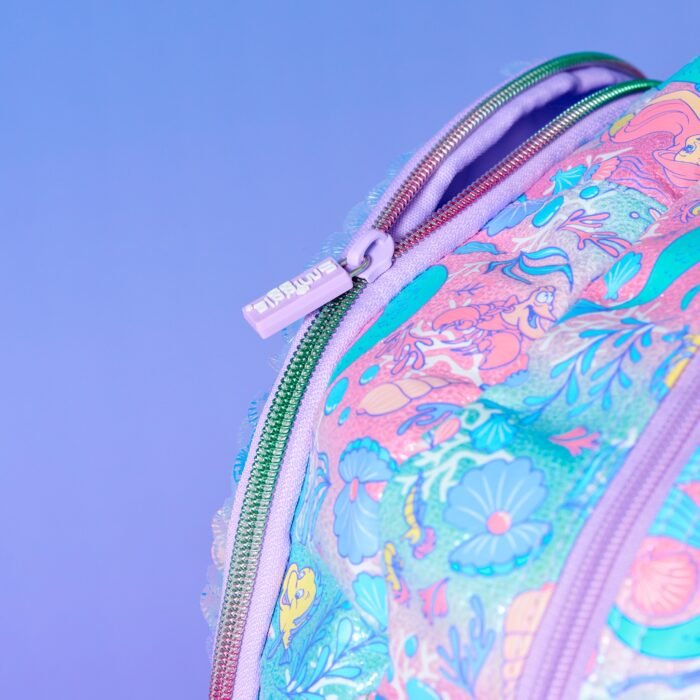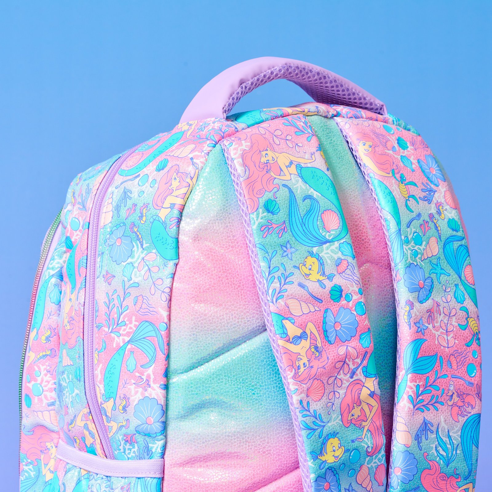 Our Genuine Smiggle Backpack has been sprinkled all over with Disney magic! Our Ariel Classic Backpack has plenty of extra whimsical details such as glimmering shell shaped sequined fabrication, padded starfish zips and iridescent paneling!