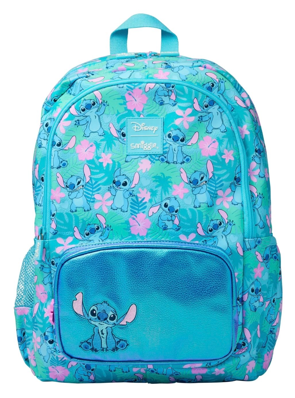 Pack essentials for extra hula lessons with our Genuine Smiggle Stitch Classic Backpack! This backpack comes with three zipped compartments, dual drink bottle sleeves, comfy adjustable shoulder straps and an inner laptop compartment for all their essentials. Plus, check out the tropical graphic print with fun-loving and cheeky Stitch expressions, character zips and Stitch embroidered badge, perfect for any fan of this adorable little monster!
