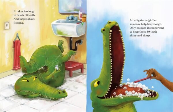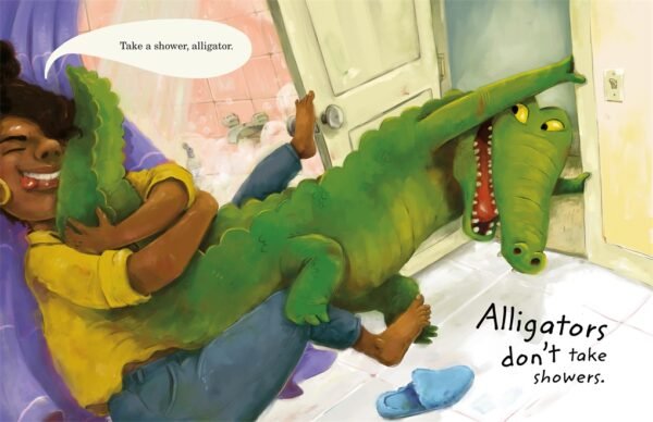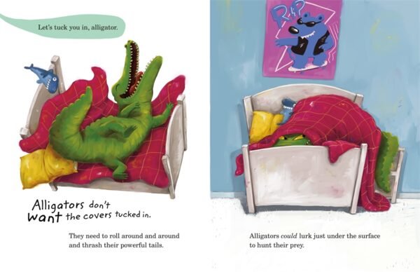 Luckily, Alligator’s parents are willing to compromise. Instead of a shower (which alligators hate), Alligator can take a bath. Instead of tucking under the covers, Alligator can lurk beneath the blankets watching for prey.