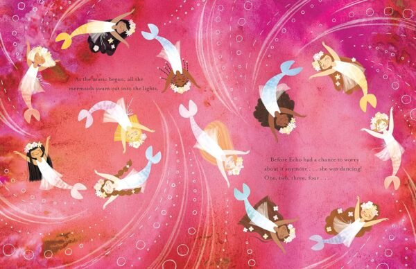 In a magical water world, the two mermaids practice their steps again and again. They dive through the water like seals, spin in circles like minnows, slither like eels, and more. But Echo is still worried that she’ll forget everything as soon as she faces the audience. So Harmony decides that they should share a secret hand squeeze, one that tells Echo You are fine, you are okay, I’m right next to you. At the crucial moment when Echo is about to stumble, will their plan work so she gets all the moves correct?