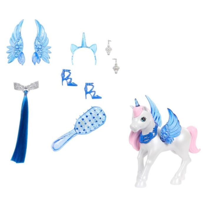 - Magical accessories inspire styling and storytelling play: a unicorn headband, removable sapphire wings, and a clip-on unicorn tail.