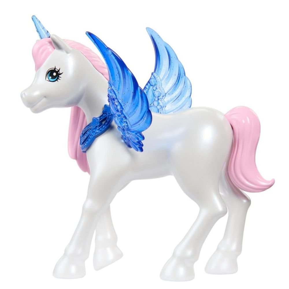 - Her alicorn pet has a sapphire blue collar and matching wings! Kids will love dreaming up fantasy adventures with Barbie doll and her winged unicorn friend.