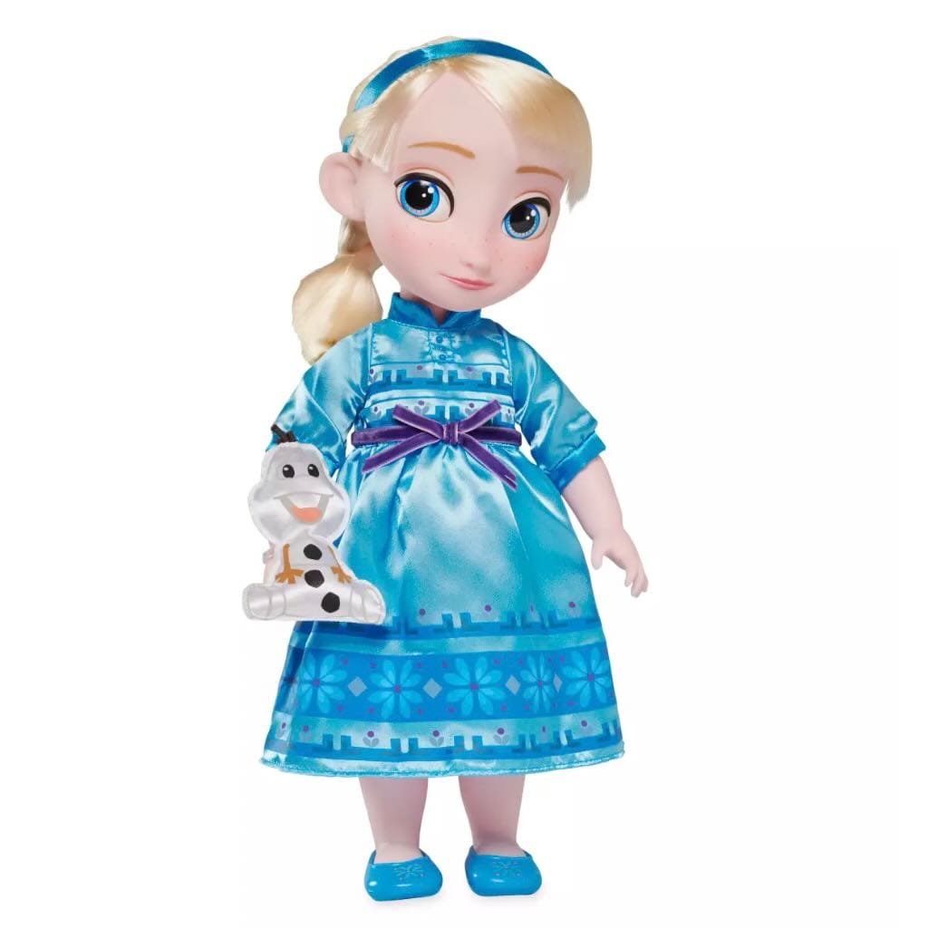 Elsa, the Frozen sister with icy powers, is reimagined as a bright-eyed little girl. Inspired by character designer Bill Schwab’s sketches, this newly refreshed doll in satin dress is accompanied by sun-loving snowman Olaf.