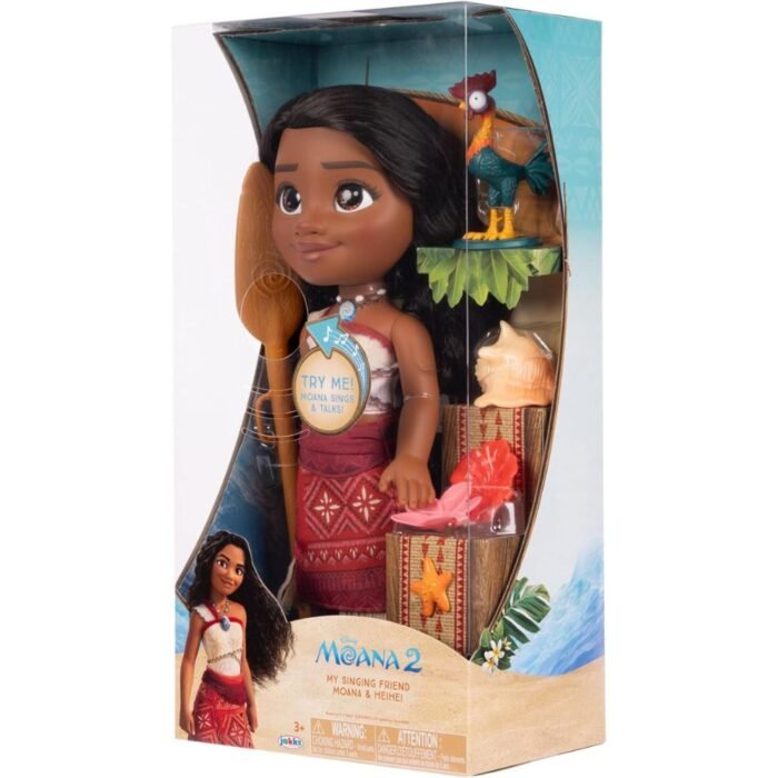 - Suggested for Ages 3+Join Moana on new adventures with My Singing Friend Moana & Heihei. Your favorite wayfinder from Disney’s Moana 2 comes dressed in an all-new fashion that’s perfect for travel across the ocean. Bring along Moana’s oar and conch shell, and style her hair and yours with island-inspired hair clips. Imagine the sea breeze as you listen to Moana doll speak to you and sing along to new song, “We’re Back.” And don’t forget Heihei, who makes every journey even more unexpected and exciting.
