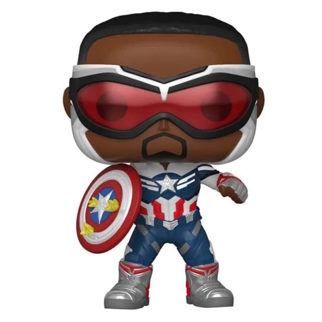 - This Pop features Sam Wilson in his red, white, and blue costume, at the ready with his shield.